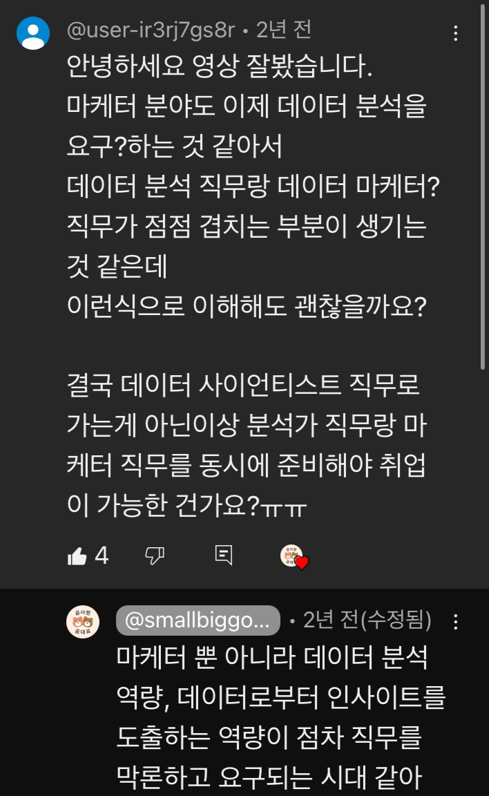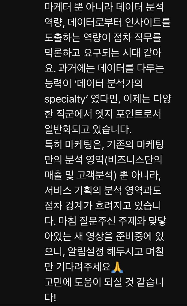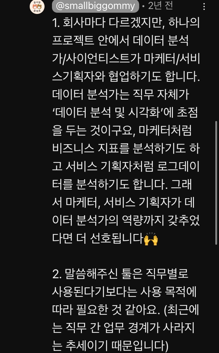 회사나 팀마다 정의하는 직무의 R&R은 각각 다를 것이고, 회사의 규모, 특성, 도메인 등에 따라 요구하는 데이터 분석의 깊이나 범위 또한 다를 것이다.